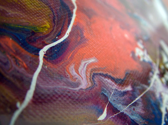 The two photos above show about a one inch square of canvas. I think that the beauty of this painting can only be appreciated up close. It’s impossible to get a full appreciation for the piece standing away from it. The other cool thing about this painting is the glossy ripple effect you can see as you walk round it. This is virtually impossible to show using a camera as I cannot simulate motion easily. What you see is a tremendous reflection of light into the pools and ripples of paint.